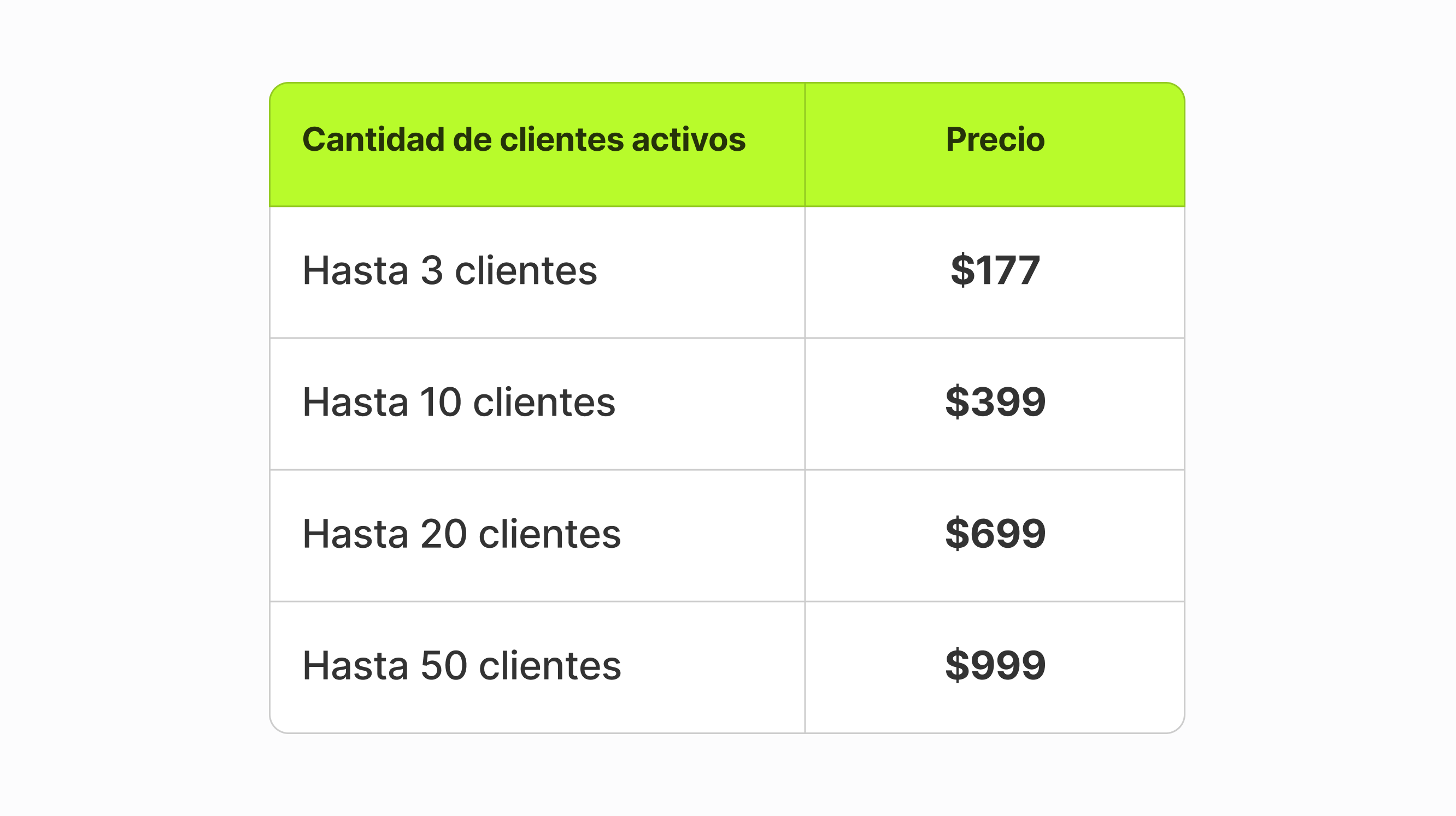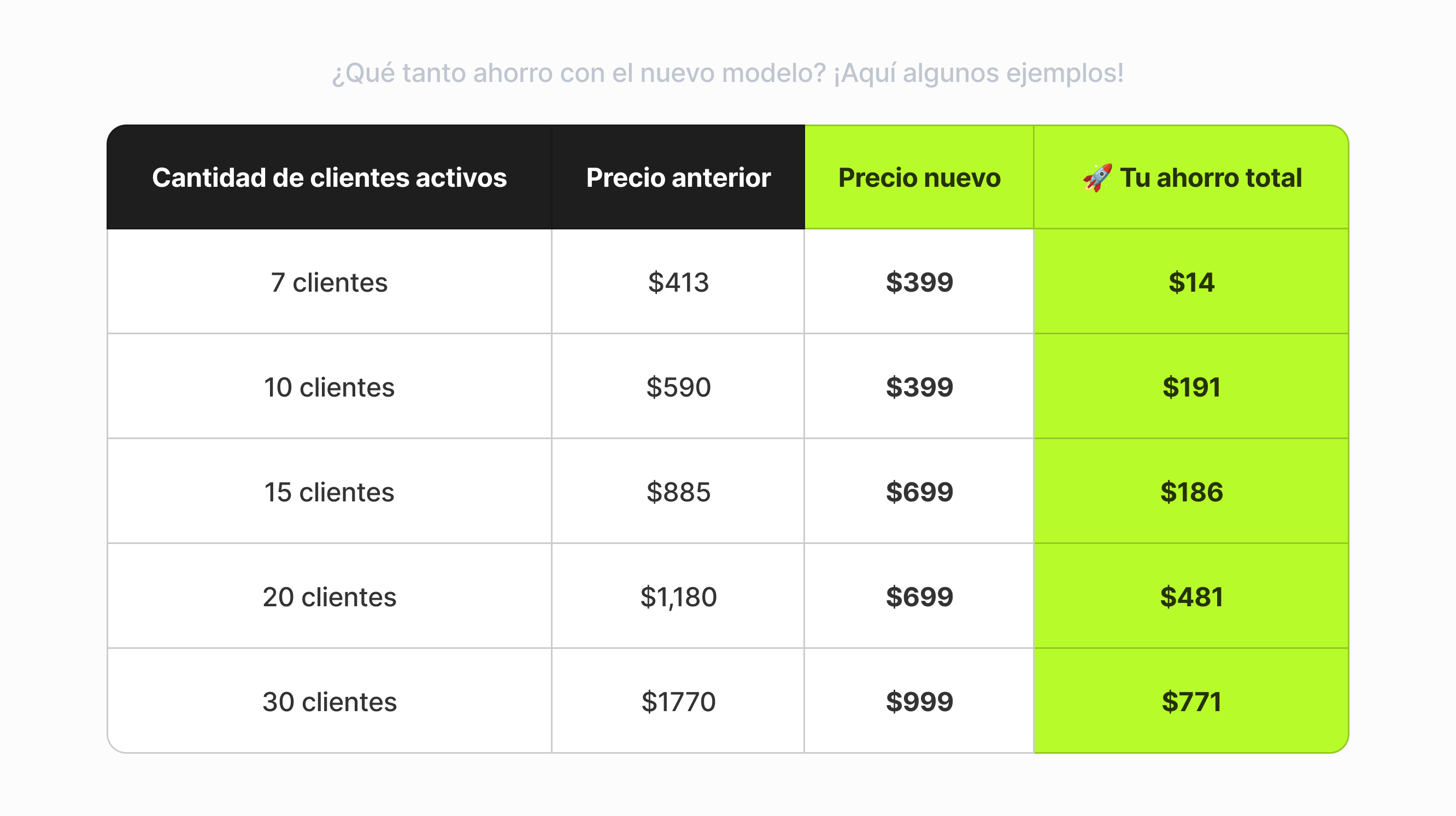 Los hemos escuchado. Nuestro modelo anterior presentaba dos desafíos principales: el cálculo complejo por cada cliente adicional y el prorrateo cuando daban de alta o baja a sus clientes durante el mes. Esto generaba facturas variables y difíciles de predecir. Por eso, hemos creado una estructura más simple y transparente que, además, hace nuestro servicio más económico conforme tu negocio crece 📈📈📈